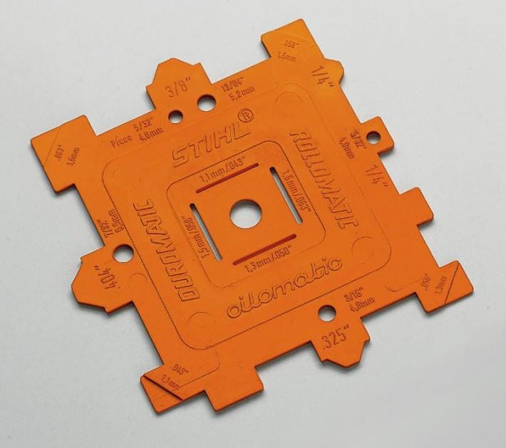 Voor het meten van de steek van de zaagketting en het kettingtandwiel alsmede van de aandrijfschakeldikte en de groefbreedte van het zaagblad.