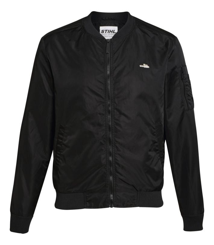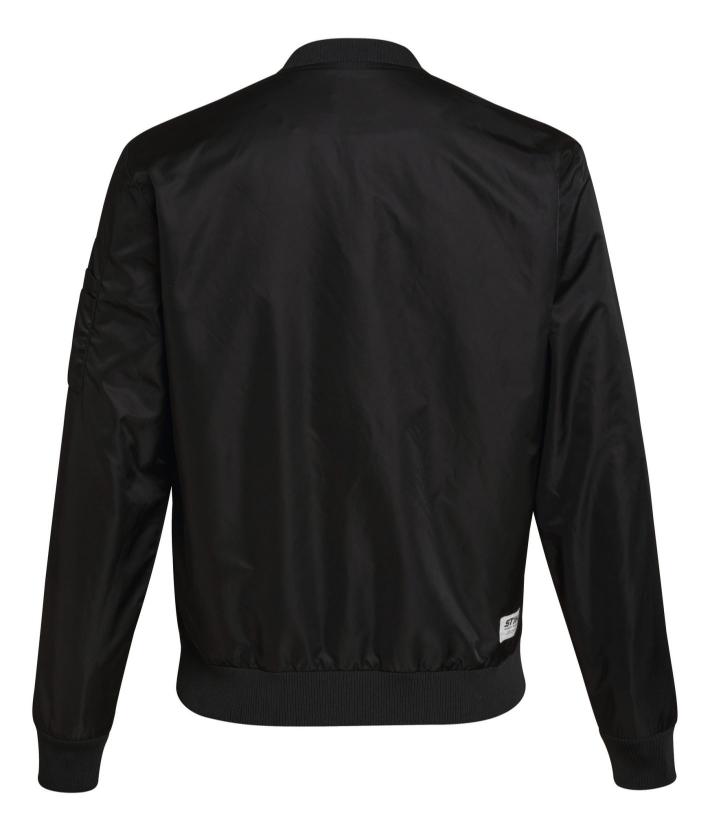 De coole variant van een tussenseizoenjasje: een satijnlook bomberjack met contrasterende geribbelde boord aan de hals, mouwen en zoom. Praktisch: zijzakken met split en een klein zakje met rits op de linkermouw. Metalen klinknagels met kettingzaag op de borst, klein geweven label op de rug.