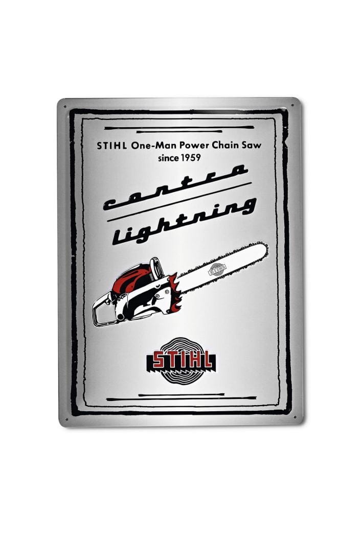 Hommage aan de eerste éénmanszaag met benzinemotor: de metalen plaat gegraveerd met »STIHL CONTRA « logo in reliëf en de originele belettering wordt een echte blikvanger op je muur, en niet alleen voor verzamelaars. Vier gaten zijn voorzien voor een eenvoudige montage.