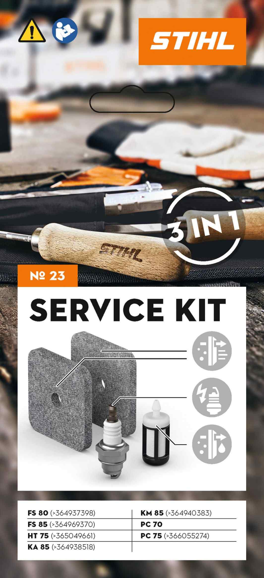 De STIHL Service Kit 23 voor FS 80 (Machinenummer > 364937398), FS 85 (Machinenummer > 364969370), HT 75 (Machinenummer > 365049661), KA 85 (Machinenummer > 364938518), KM 85 (Machinenummer > 364940383), PC 70 en PC 75 (Machinenummer > 366055274) bevat de volgende elementen voor een standaardonderhoud: