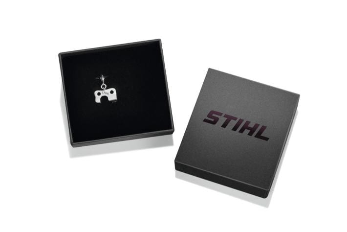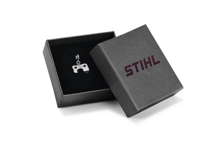 Deze sleutelhanger is een miniatuur zaagtand / kettingschakel. Deze is gebaseerd op een originele kettingschakel van een STIHL zaagketting en is 18 mm lang en gemaakt uit gerodineerd 925-zilver.